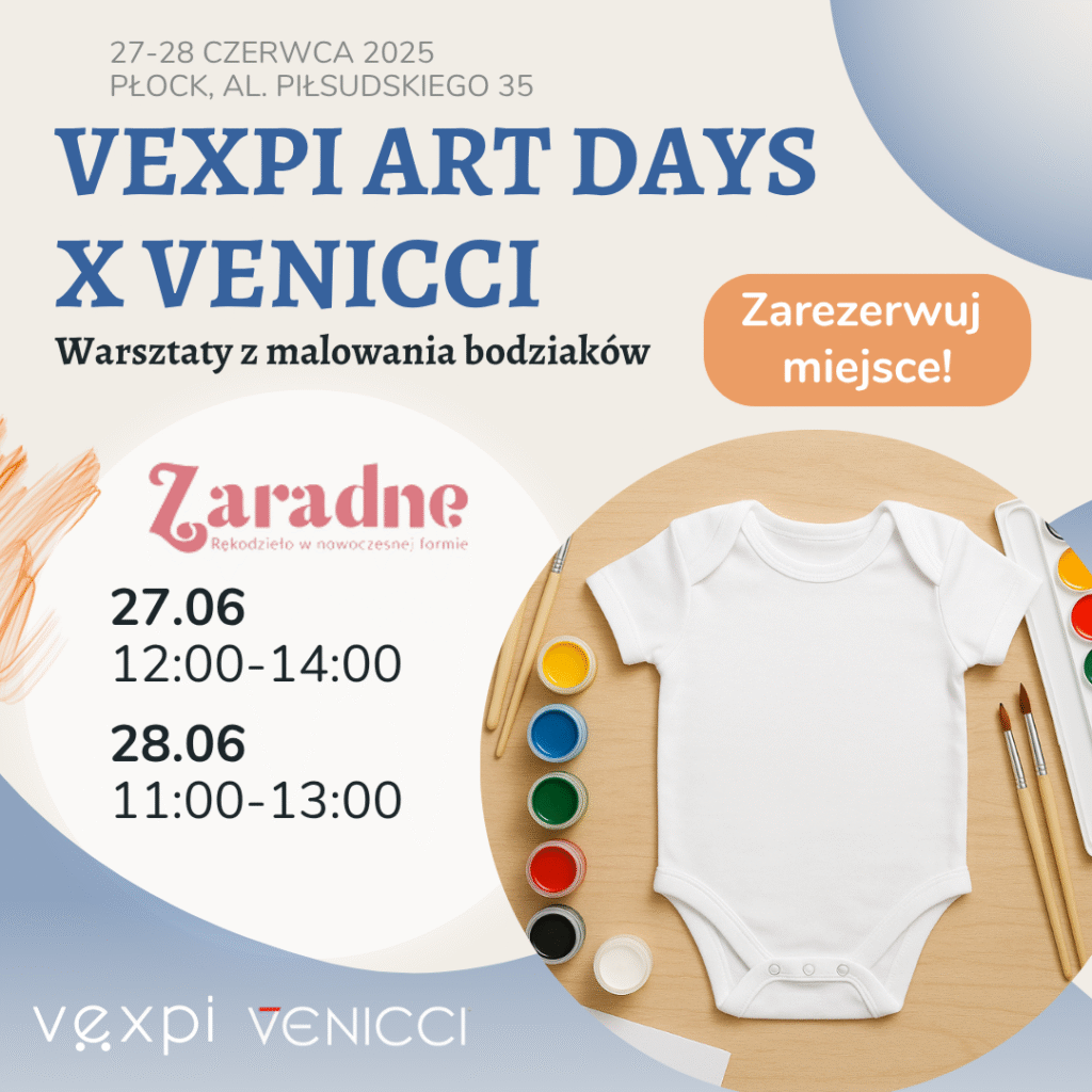 W ramach Vexpi Art Days – kreatywnej imprezy, organizowanej z marką Venicci, pragniemy przypomnieć Ci o tym, że rodzicielstwo to nie tylko ogromna odpowiedzialność, ale przede wszystkim radość oraz sposobność do kreowania szczęśliwego, barwnego świata swojej pociechy.